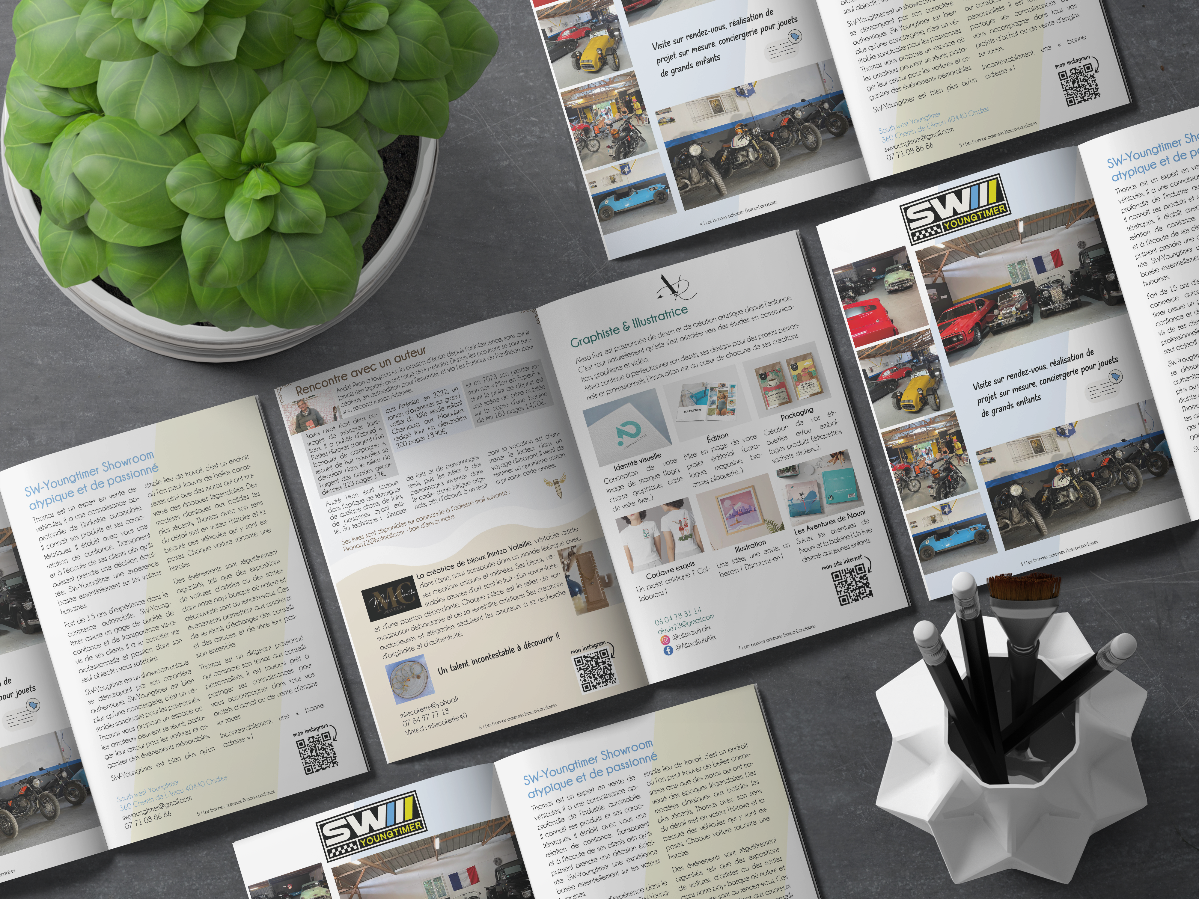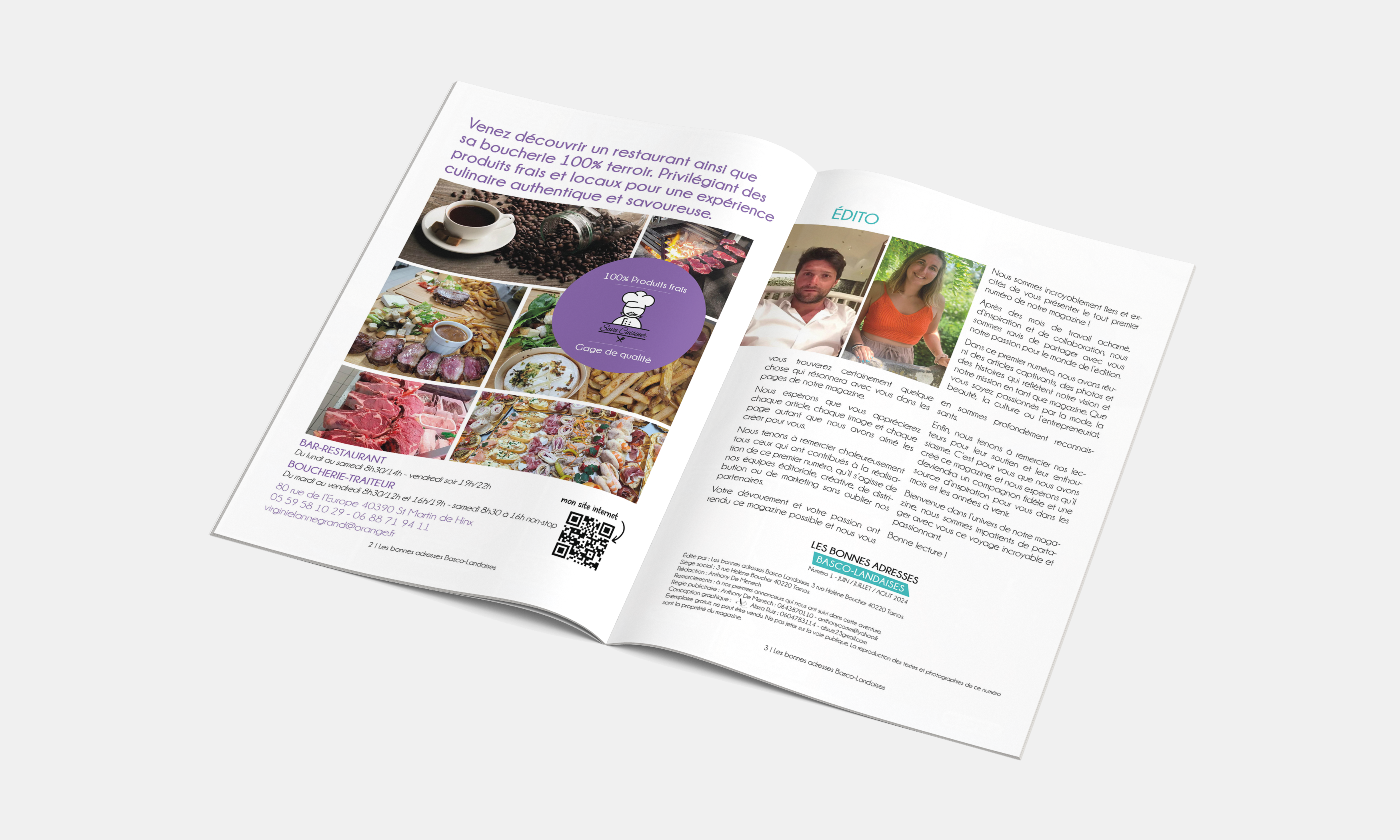 Réalisation de la mise en page et de la conception graphique du magazine Les Bonnes Adresses Basco-Landaises, un support éditorial mettant en avant des entreprises locales, des commerces et des initiatives du territoire.